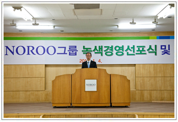세계는 지금 이산화탄소 배출로 인한 지구온난화 문제로 “녹색성장”이라는 새로운 방식의 경영활동에 관심을 기울이고 있다. “녹색성장(Green Growth)”이란 환경(Green)과 성장(Growth)을 모두 포괄하는 것으로, 산업사회에서는 서로 배치되는 의미인 것 같으나, 두 개념은 이미 선진국에서 새로운 성장 패러다임으로 자리 잡고 있다. 노루그룹은 “아름다운 세상, 깨끗한 환경”이라는 캐치프레이즈 하에, 오래 전부터 환경의 소중함을 바탕으로 한 경영이념을 통해 이미 녹색경영을 실천해 오고 있다.