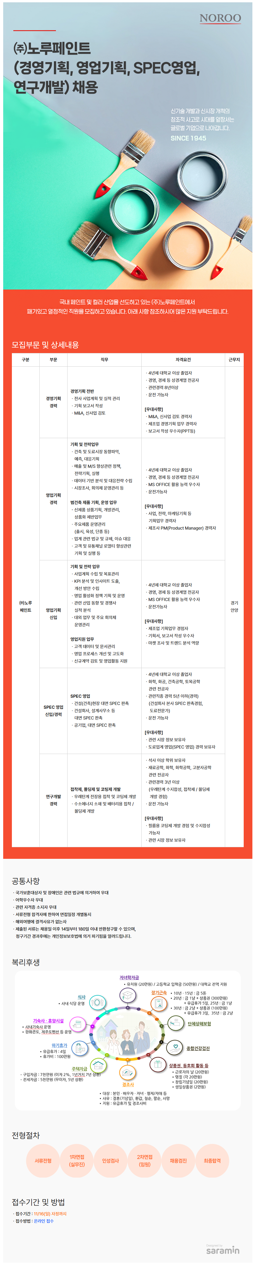 노루페인트 웹사이트에 게시된 이메일 주소가 전자우편 수집 프로그램이나 그 밖의 기술적 장치를 이용하여 무단으로 수집되는 것을 거부하며, 이를 위반시 정보통신망법에 의해 형사처벌됨을 유념하시기 바랍니다.