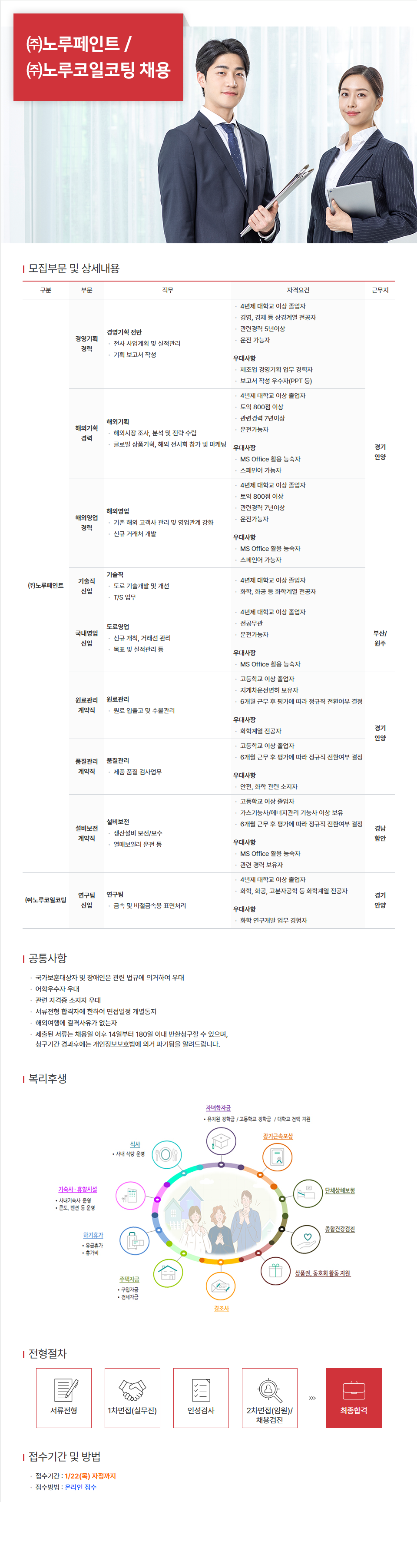 (주)노루페인트는 개인정보보호를 위하여 관리자를 한정하여 그 수를 최소화하며 회원 개인정보의 분실, 도난, 유출, 변조 등으로 인한 이용자의 손해에 대하여 모든 책임을 집니다.